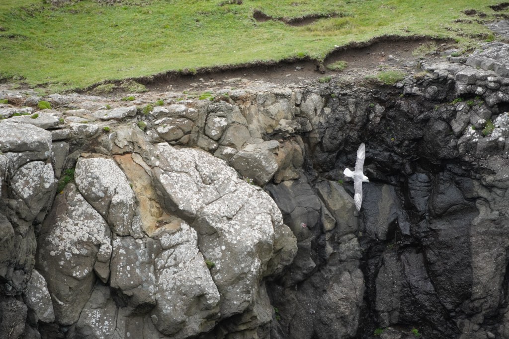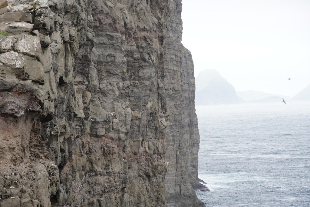When I reached Trælanípa, a spectacular cliff was revealed with the view of the Atlantic Ocean. Northern fulmars were soaring in the coastal winds and Faroese sheep were grazing in what seemed dangerously close to the edge.