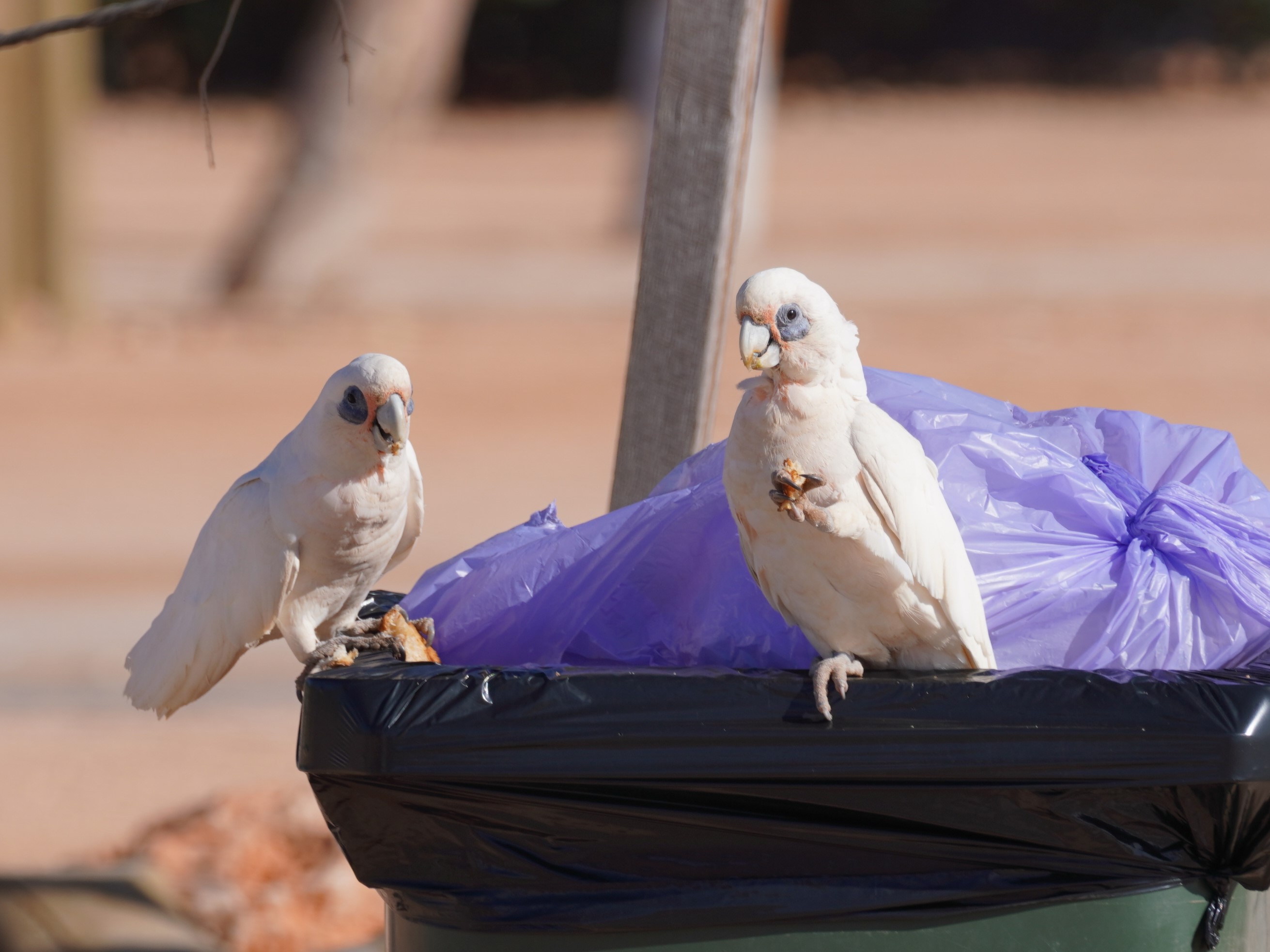 This pair of little corella were fearlessly defending this apparently very appealing dumpster in one of the campgrounds in Exmouth, Western Australia.