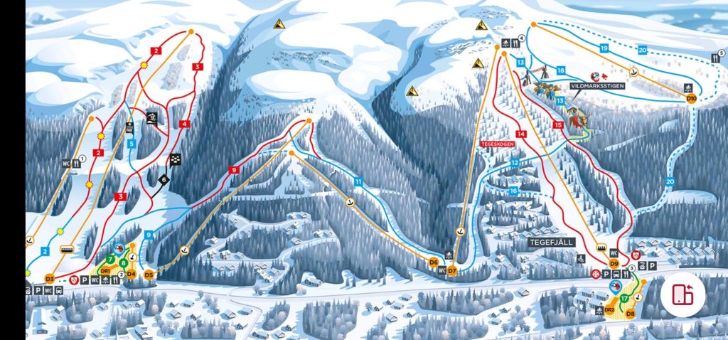 In Tegefjäll (select ‘Duved’ on the SkiStar map, see map number 1 below) there is a good beginner slope (the green one). There are also 3-4 blue slopes, my favorite being the Vildmarkstigen (En: The Wilderness Trail), but it is difficult unless you have mastered your turns and swift/abrupt breaks.