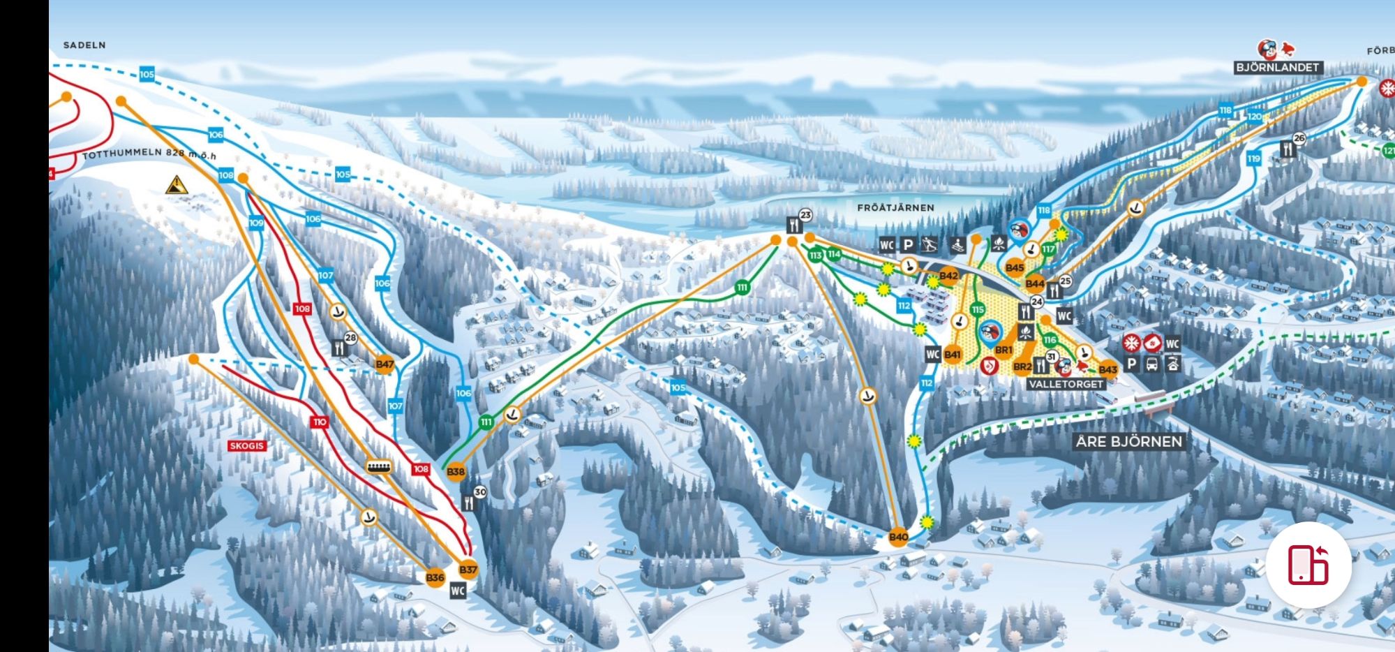 In Tegefjäll (select ‘Duved’ on the SkiStar map, see map number 1 below) there is a good beginner slope (the green one). There are also 3-4 blue slopes, my favorite being the Vildmarkstigen (En: The Wilderness Trail), but it is difficult unless you have mastered your turns and swift/abrupt breaks.